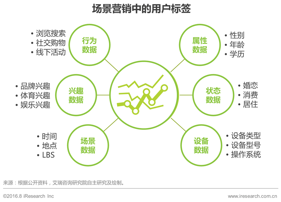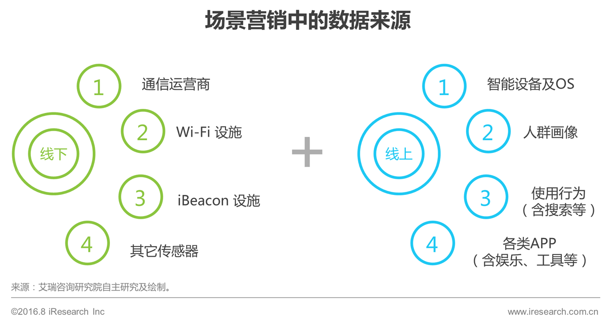 场景营销中实现广告的_և场景化投放,很大E度上依赖于数据的真实、多l以?qing)结构化。相较于传统|络营销Q场景营销中数据来源更Z富,可分Z大类别:(x)1Q线下来源,如通信q营商、Wi-Fi设施、iBeacon设施和其它传感器{;2Q线上来源,如智能设备、智能OS、h画像、用行为和各类APP{?/P>