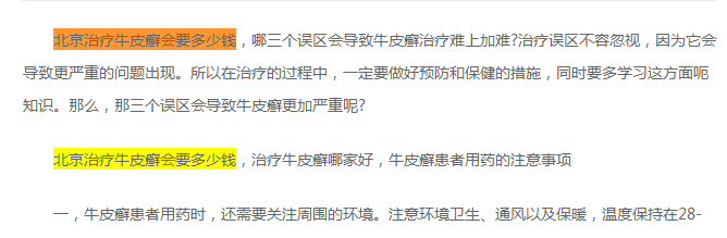 我們做seo的都知道,只要內(nèi)容收錄了,標(biāo)題就會(huì)有競爭排名的權(quán)利,如果你的一篇內(nèi)容寫的很好的話,可能就會(huì)出現(xiàn)特別好的排名,而有很多的瀏覽者就是根據(jù)你的標(biāo)題從而進(jìn)入你的文章內(nèi)容的,但是如果你的標(biāo)題與內(nèi)容不符,用戶可能匆匆看上一兩秒就會(huì)關(guān)閉了,這種內(nèi)容是非常常見的。像標(biāo)題與內(nèi)容不符的情況最常見得還是醫(yī)療網(wǎng)站,只是有一個(gè)吸引人的標(biāo)題,但是進(jìn)入以后寫的卻是別的內(nèi)容。比如:北京治療牛皮癬會(huì)要多少錢: