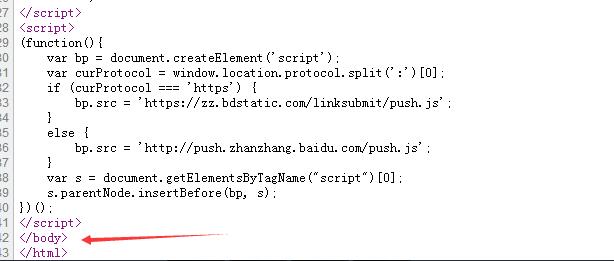 在這里,優(yōu)化師把主動推送代碼加入在</body>上方,其主要目的是為了讓這個代碼起到推送整站的目的!