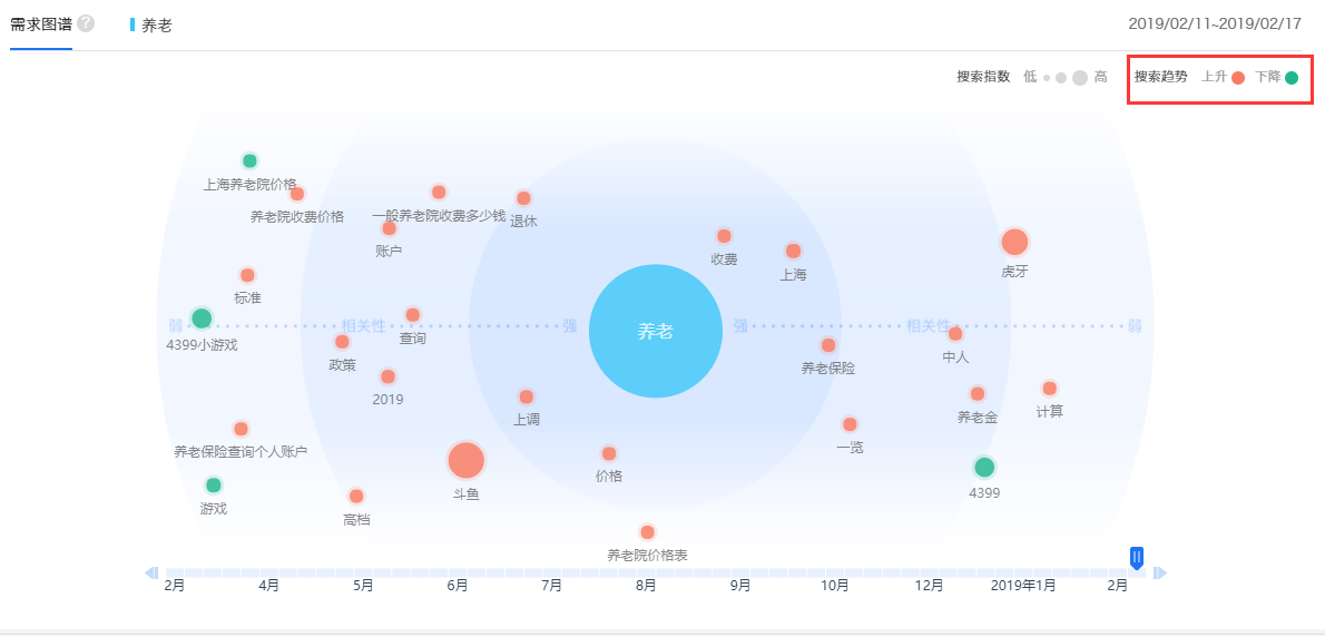 我們?cè)賮?lái)看一張圖,需求圖譜,這張可以看養(yǎng)老這個(gè)關(guān)鍵詞相關(guān)需求趨勢(shì),這對(duì)你選取的方面具有一定的參考建議。