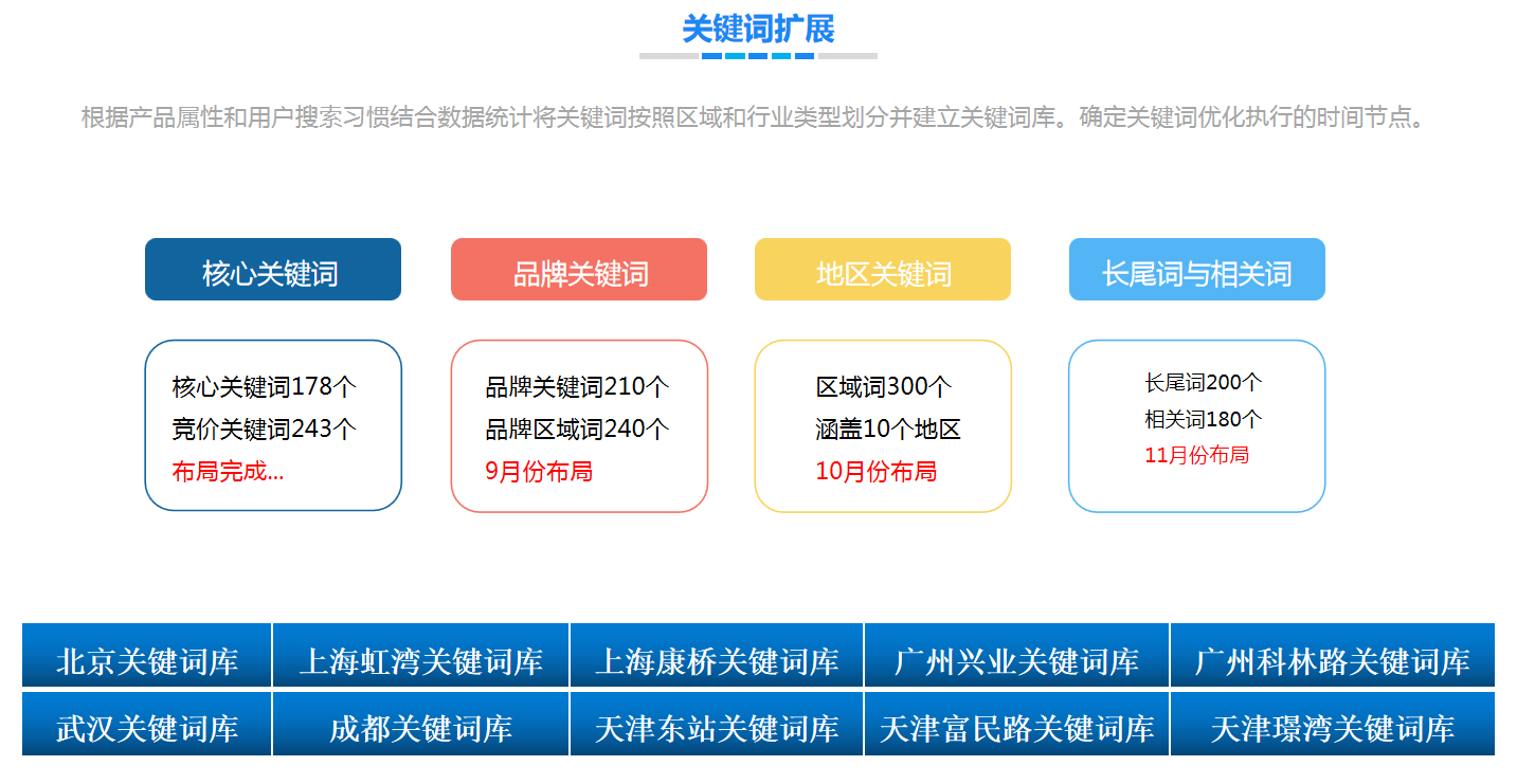 Ҏ(gu)产品属性和用户搜烦?fn)惯l合数据l计关键词按照区域和行业类型划分ƈ建立关键词库。确定关键词优化执行的时间节炏V?