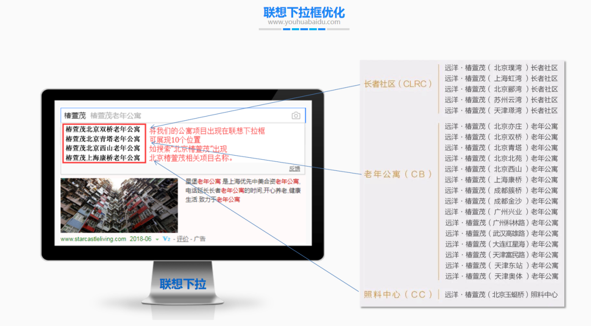 扩展相关词、优化联想下拉词、优化第三方内容、提升网站整体权重和优化索过E、提升目标流量{化?